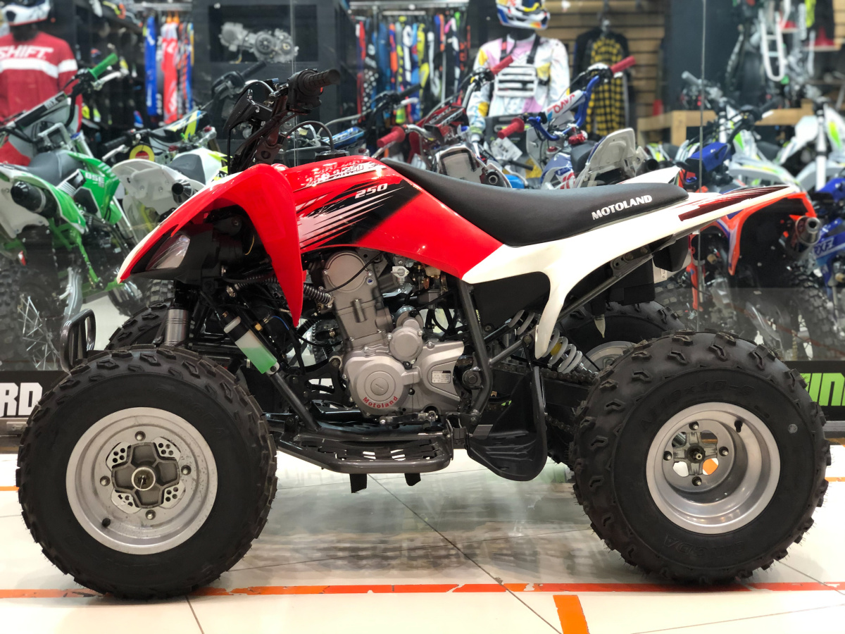 Новинка от компании MOTOLAND, в модель заложен опыт и наработки за многолетний период работы. Дизайн спортивный в фирменной расцветке, сочетание красного и белого. Смотрится отлично, без лишних надписей и кричащих наклеек. Рама стальная, сухая масса квадроцикла 156 кг. Стоит отметить еще один весомый плюс, двигатель с жидкостным охлаждением. У вас не будет проблем с перегревом, можете кататься сколько захотите. Максимальная скорость около 120 км/ч, впечатляющая цифра. Дополнительный комфорт добавляет подвеска, она усиленная с регулировкой жесткости. Готов к испытаниям на бездорожье. MOTOLAND ATV 250S оборудован фарой и резиной с грязевым протектором. В нашем магазин представлен огромный выбор техники, можно посмотреть все в живую и выбрать модель, наиболее подходящую именно вам.